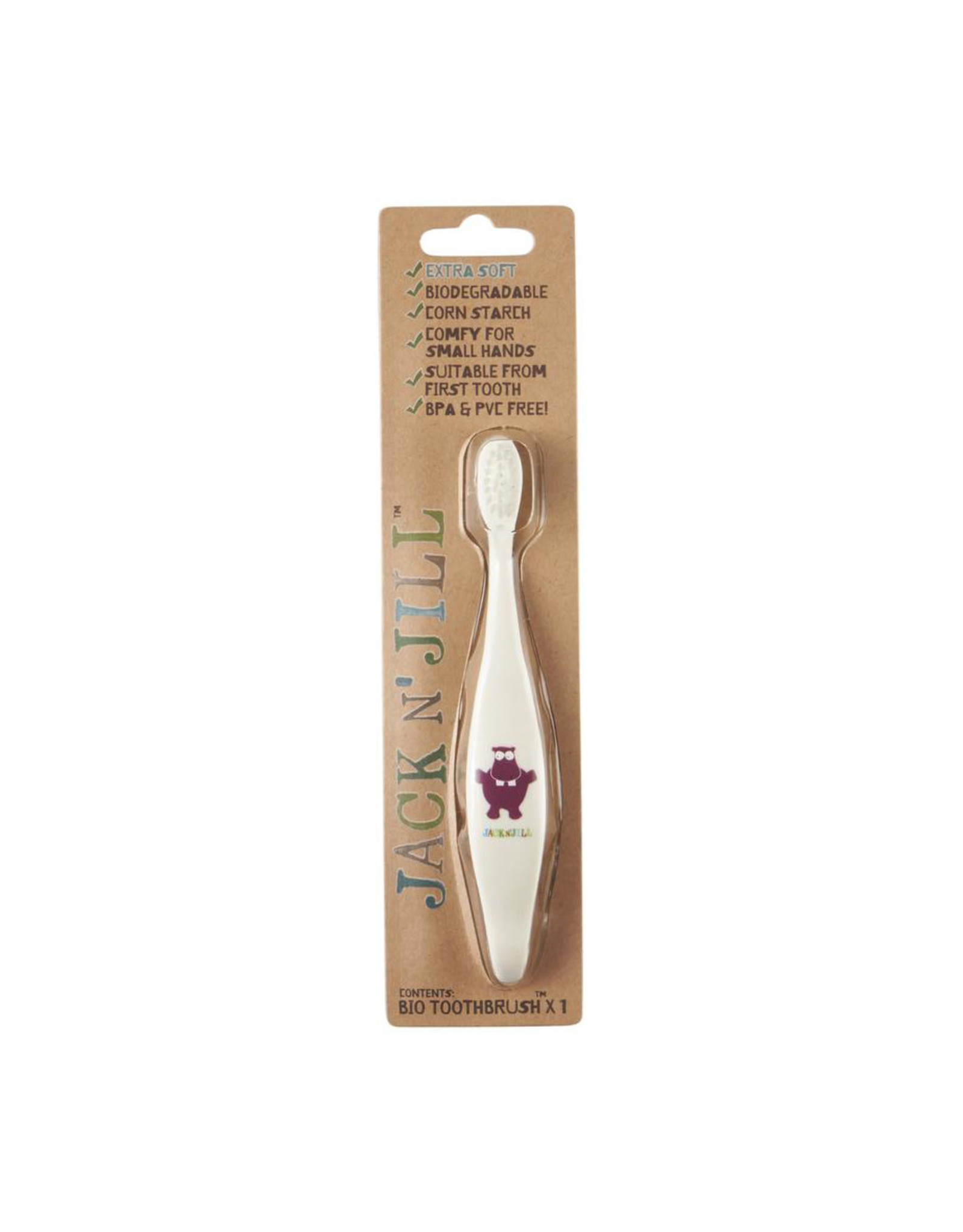 Jack N' Jill bio tandenborstel heeft een handvat dat voor 100% gemaakt is uit maiszetmeel en zachte, recycleerbare nylonharen. Het is de eerste in zijn soort, speciaal ontwikkeld voor kinderen.